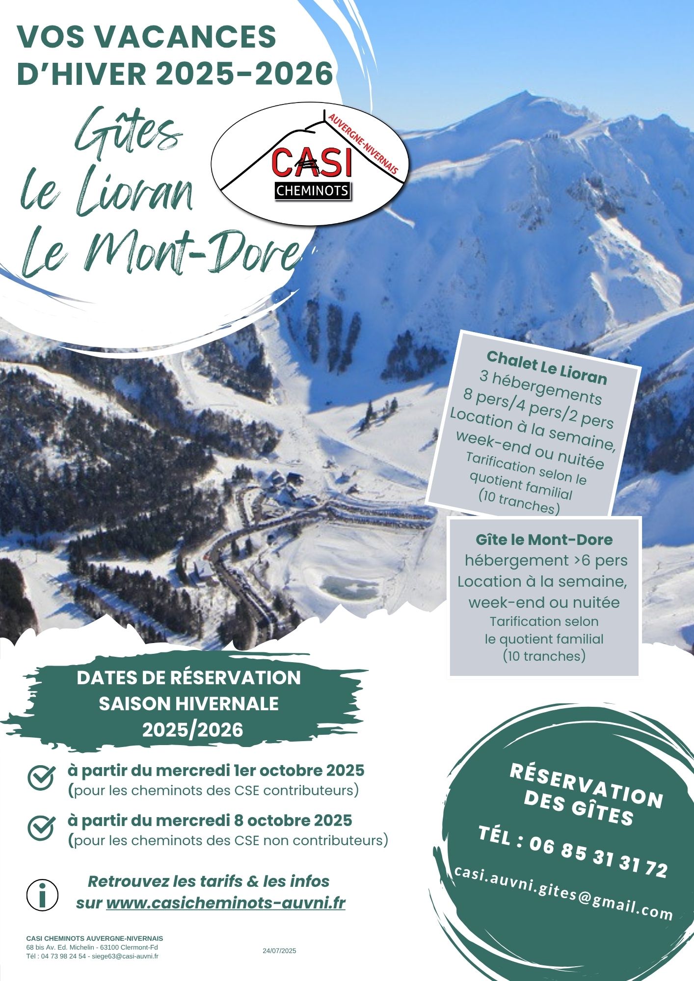 Date de réservation pour l’hiver 2025/2026 : – à partir du mercredi 1er octobre (cheminots CSE contributeurs) – à partir du mercredi 8 octobre (cheminots CSE non contributeurs) En savoir + sur les gîtes & les tarifs